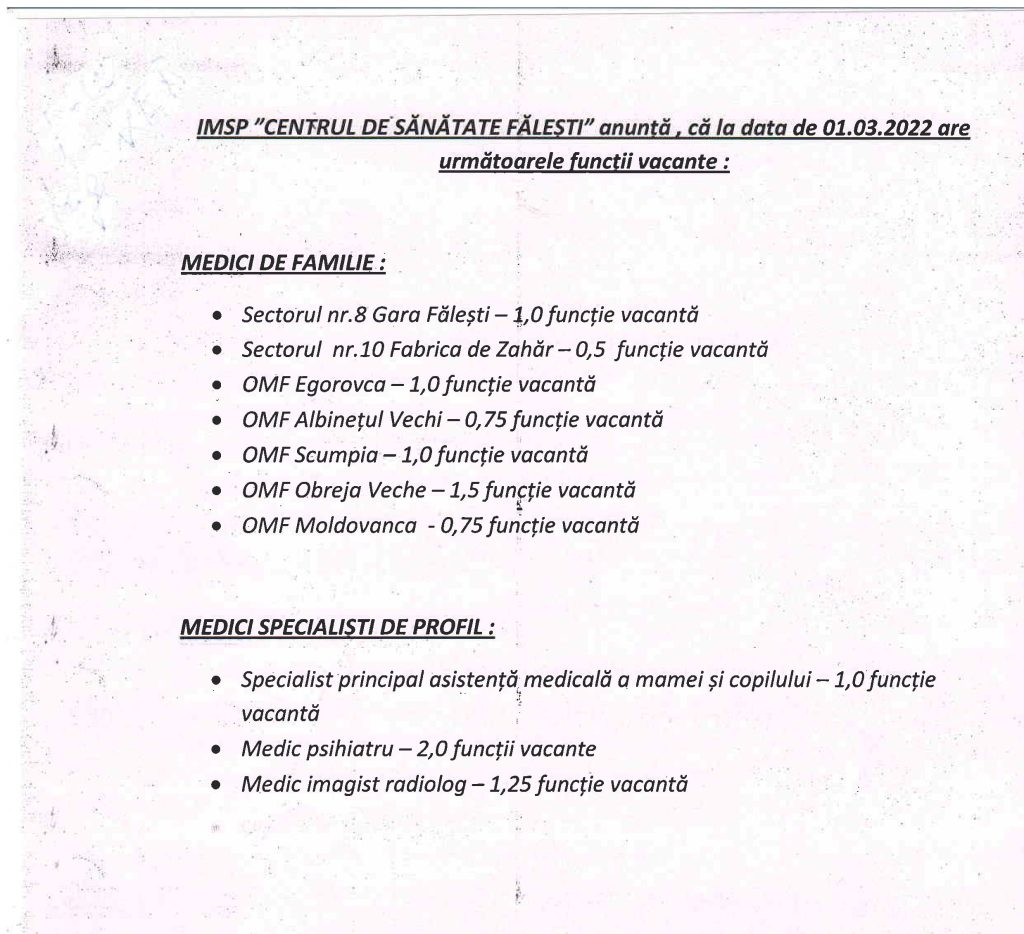 IMSP „Centrul de Sănătate Fălești” anunță funcțiile vacante în cadrul instituției